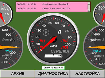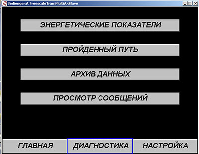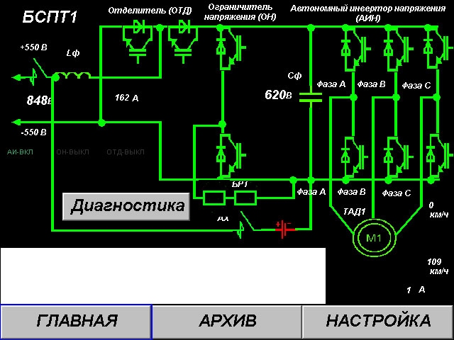 Информационно-диагностическая система, разработанная в НПП “ЭПРО” позволяет отображать и хранить такие параметры, характеризующие текущее состояние электропривода и схемы управления вагоном, как скорость движения, напряжение контактной сети, напряжение на конденсаторах преобразователя, напряжение аккумуляторной батареи, ток заряда аккумуляторной батареи, ток бортового преобразователя (БПН), действующее значение тока двигателей, входной ток, сообщения об аварийных режимах работы, позиции контроллера водителя, признак нейтрального положения контроллера водителя, признак 8-й тормозной позиции, сигнал разрешения включения АВДУ, сигнал включения АВДУ, сигнал замещения электротормоза механическим, состояние педали безопасности, состояние органов управления рельсовым тормозом, команда “Автономный ход”, включение автомата рельсового тормоза, состояние контактора автономного хода, учет потребленной энергии