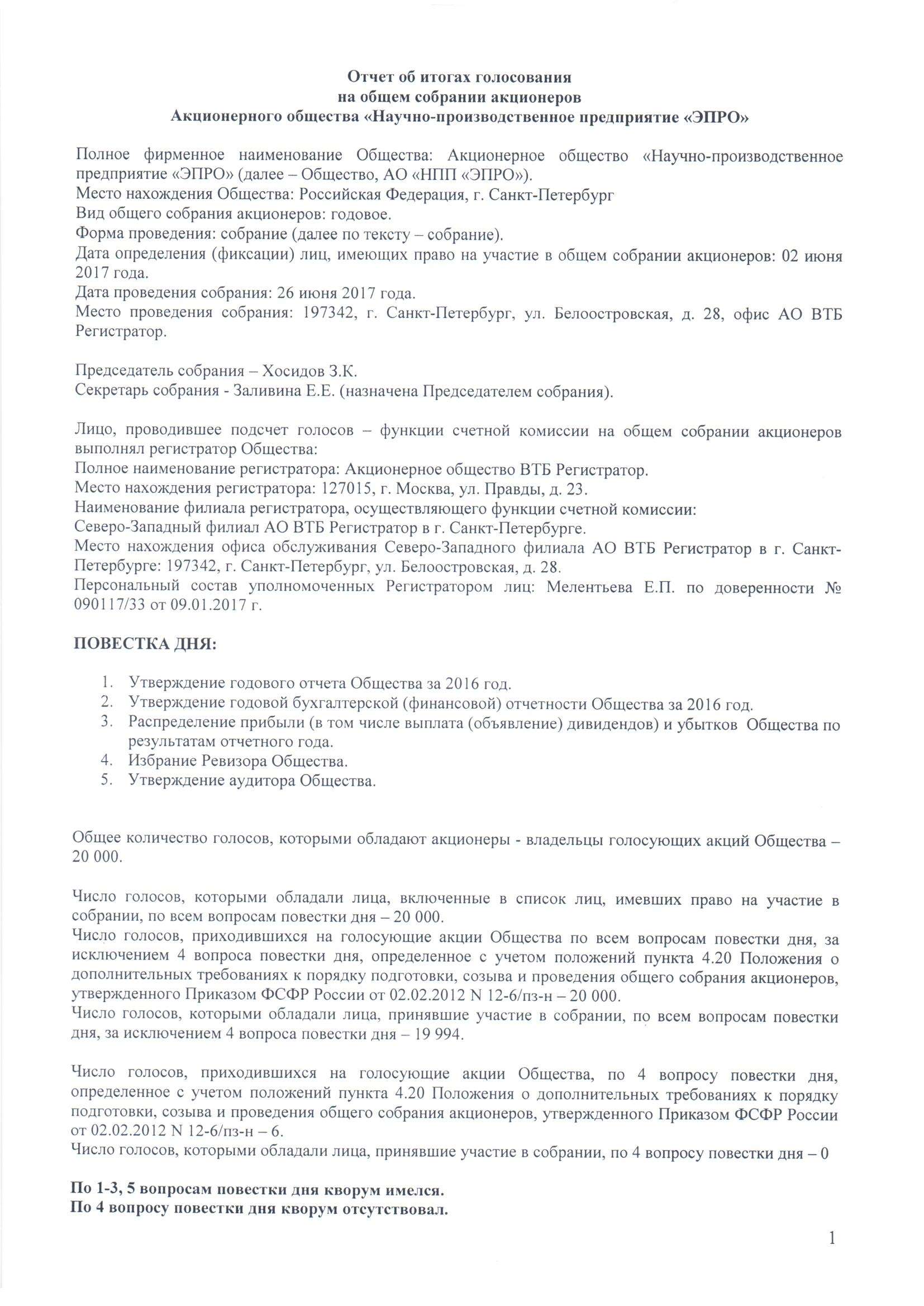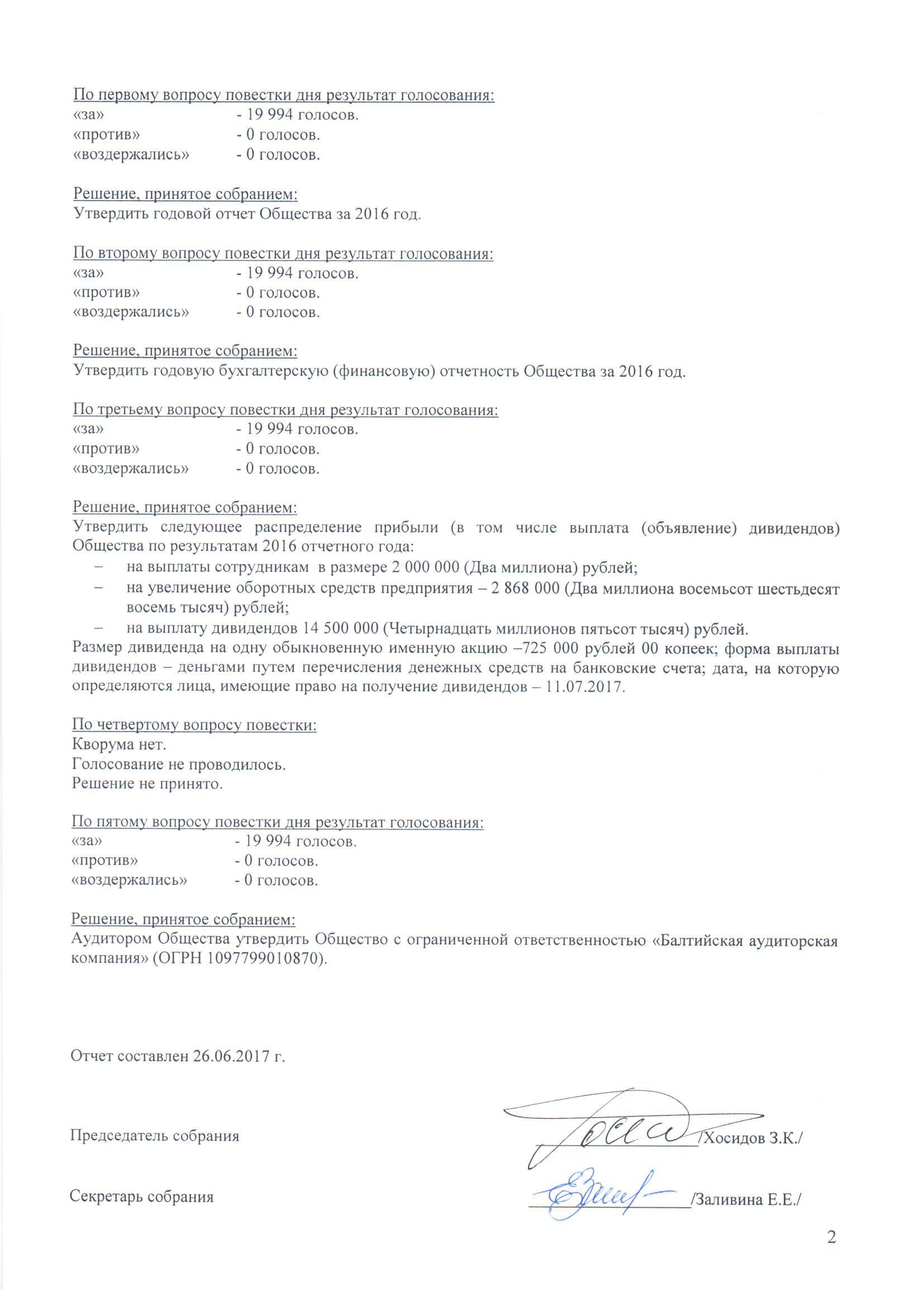 29.06.2017г. Отчет собрания акционеров за 2016г.